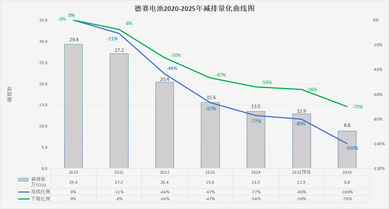 2020年德賽電池(仲愷工業(yè)園)的范圍1、2、3碳排放總量約為29.4萬噸,德賽電池通過不懈努力,僅至2024年,公司已成功將碳排放總量削減至約13.5萬噸(已完成77%的目標),實現(xiàn)相對于基準年碳排放總量54%的顯著減排,2025年預計碳排總量約為12.9萬噸(預計完成80%的目標),實現(xiàn)相對于基準年碳排放總量56%的顯著減排。